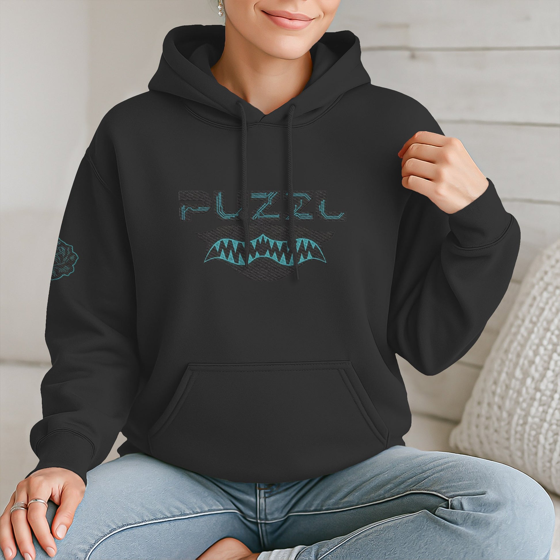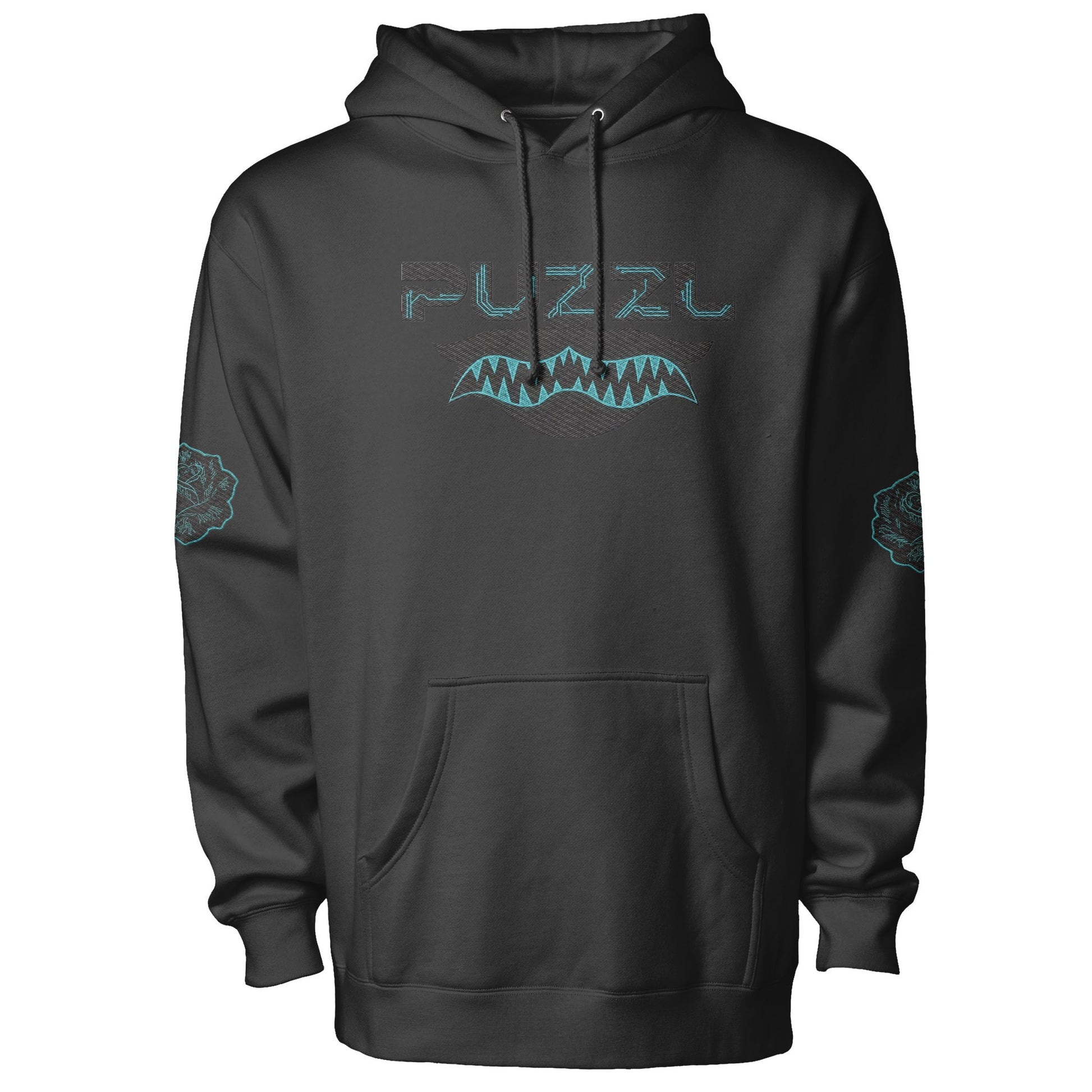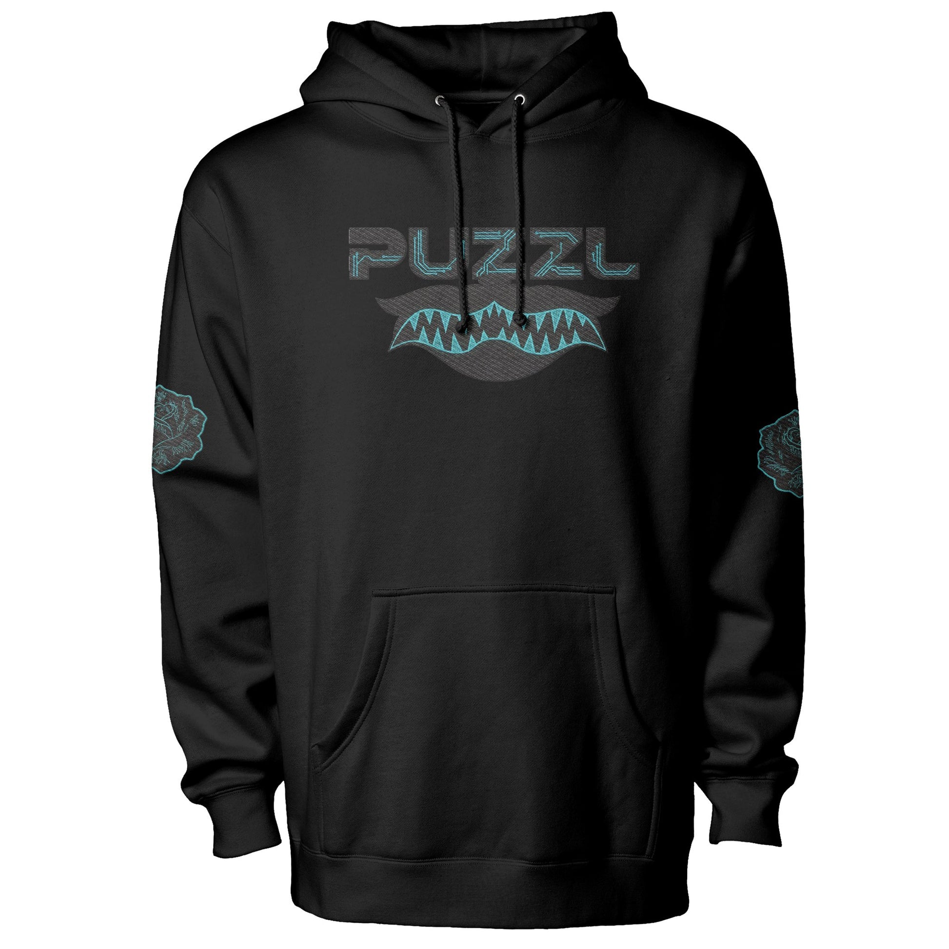 The Circuit Bloom Embroidery pushes the Digital Bloom aesthetic into a futuristic direction. The PUZZL mark sits above a serrated cyber-fang motif, stitched with structural precision, while circuit-wired roses connect the design back to the collection’s floral foundation.