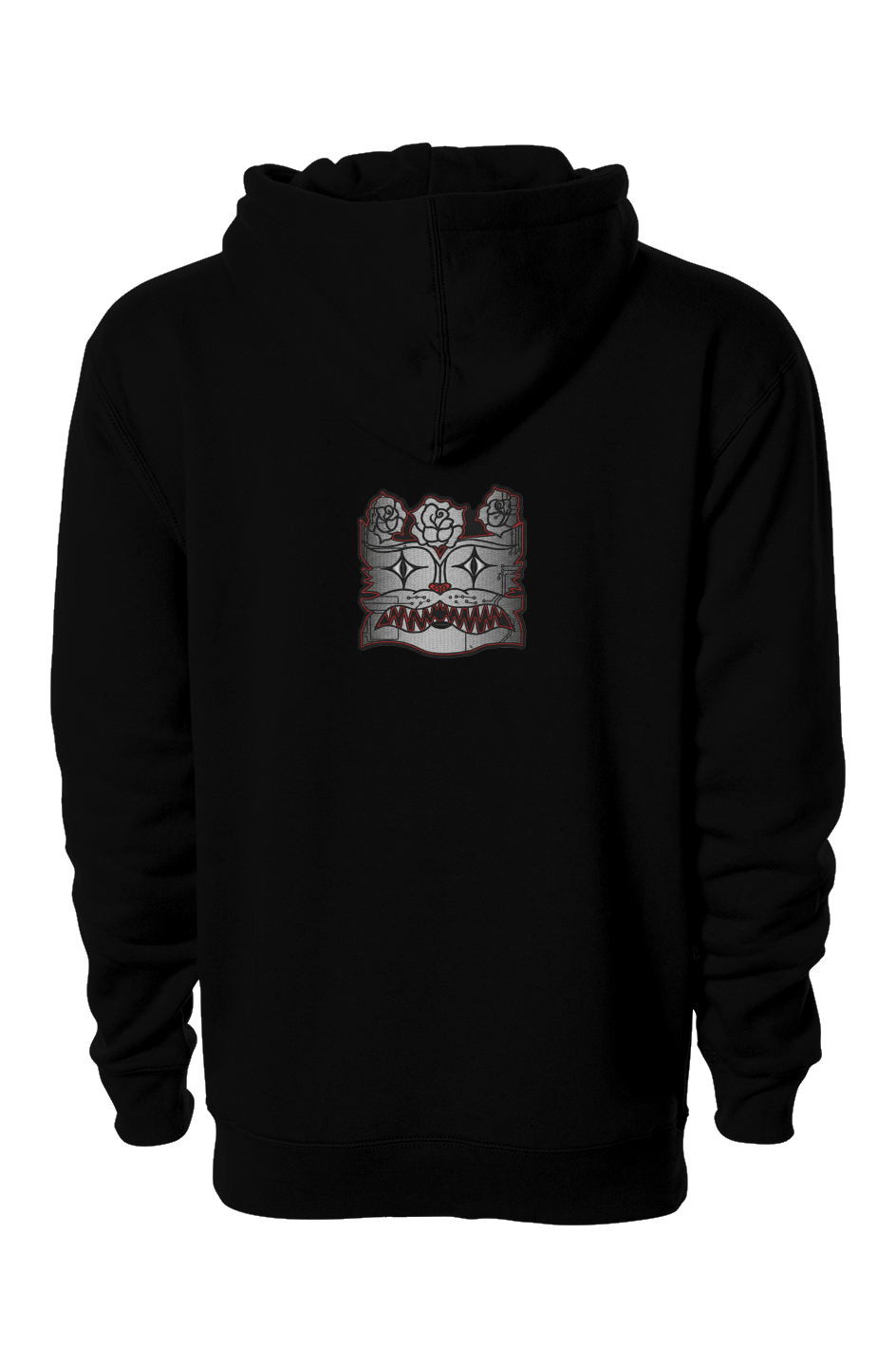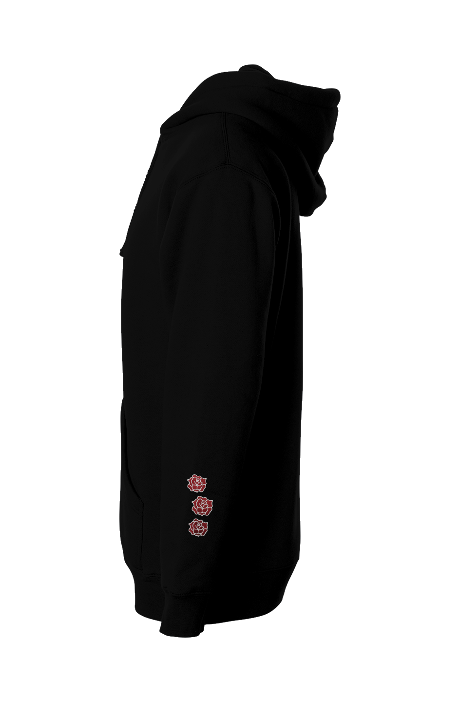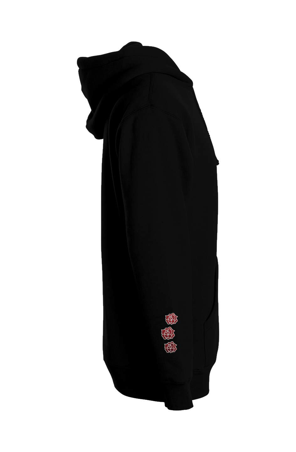 This dual-placement design creates a full narrative without overwhelming the garment: identity on the front, symbolism on the back, and sleeve roses tying the story together. The result is a sleek reinterpretation of the ArtStitch Winner artwork, preserving its attitude in a more understated execution.